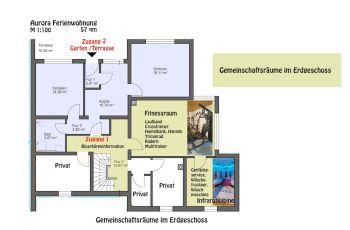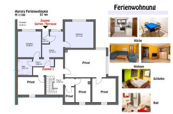 Größe: 57 m², 1 Schlafzimmer, Wohnzimmer, Küche, Bad, Terrasse