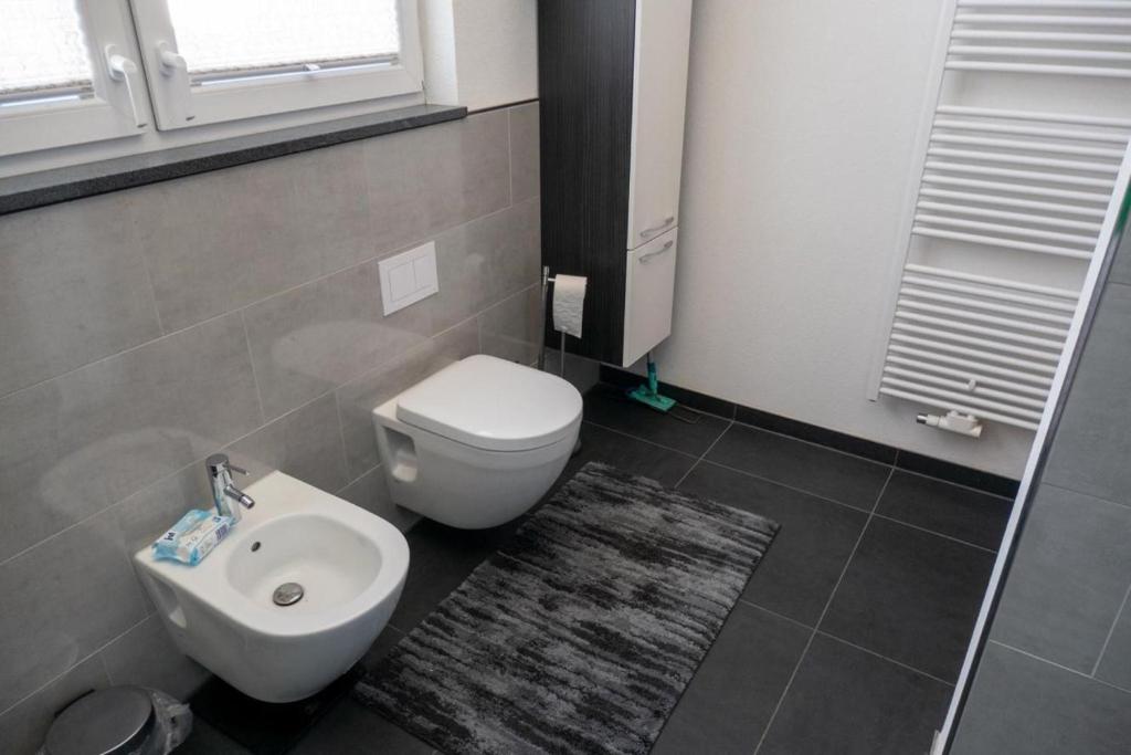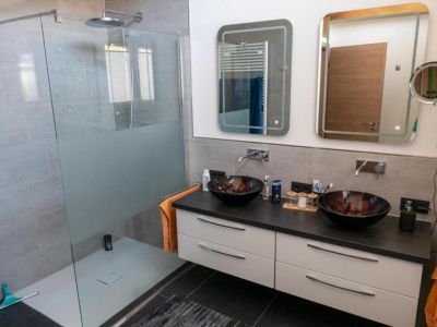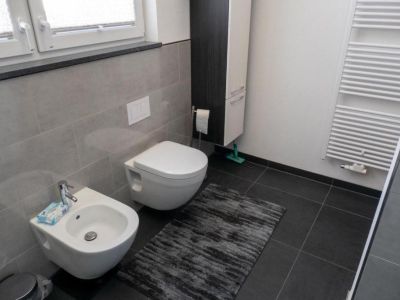 - Badezimmer: Doppelwaschbecken, spritzfreie, hohe Toilette, Bidet, Dusche mit flachem Einstieg und Regenbrause, zwei Handtuchwärmer