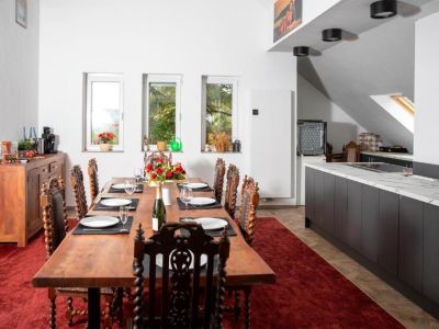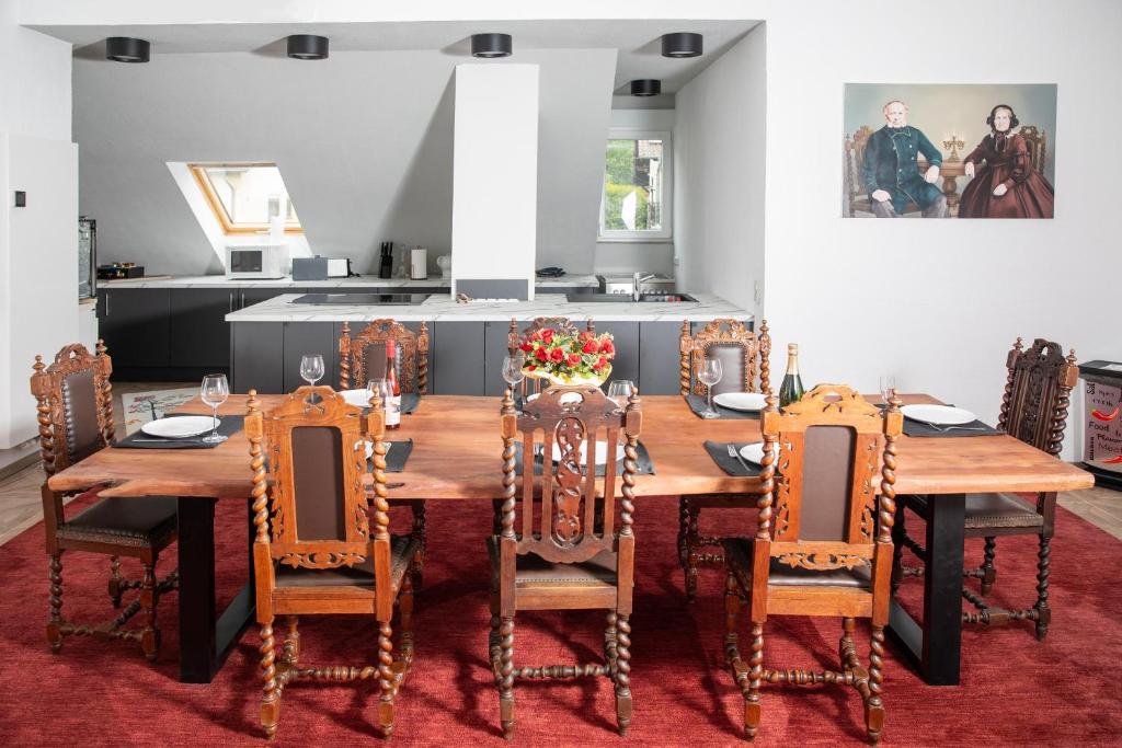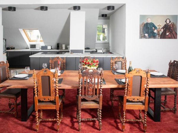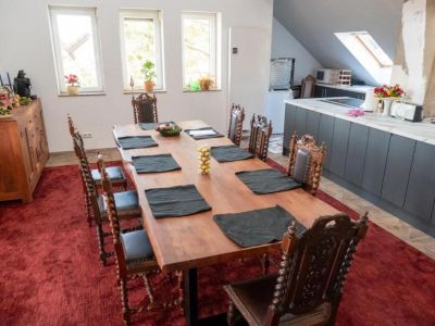 - Esbereich: großer Tisch mit antiken Stühlen