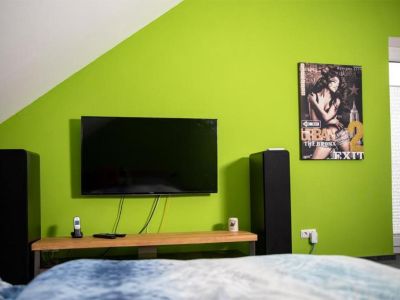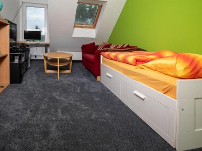 Alte Schmelz: Einzelbett ausziehbar zum Doppelbett, TV, Tuner, DVD-Player, X-Box one, weicher Teppich, kleiner Schreibtisch - Wohnzimmer: Smart-TV, Receiver zum Hören eigener Musik, große Couch-Landschaft
