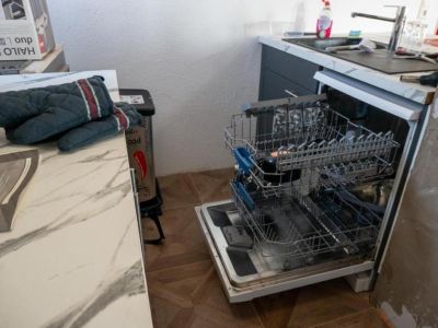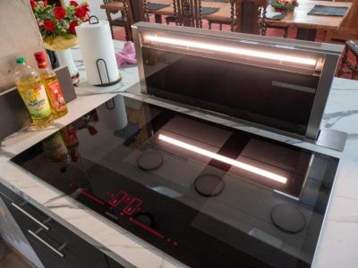 - Küche: großes Induktionskochfeld, Dunstabzugshaube, Vielzahl von Töpfen Geschirrspüler, Mikrowelle, Mixer, Elektrowage, Backofen mit Backformen und Auflaufform, große Kühlgefrierkombination, Willkommensgetränke im Kühlschrank